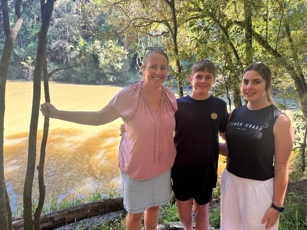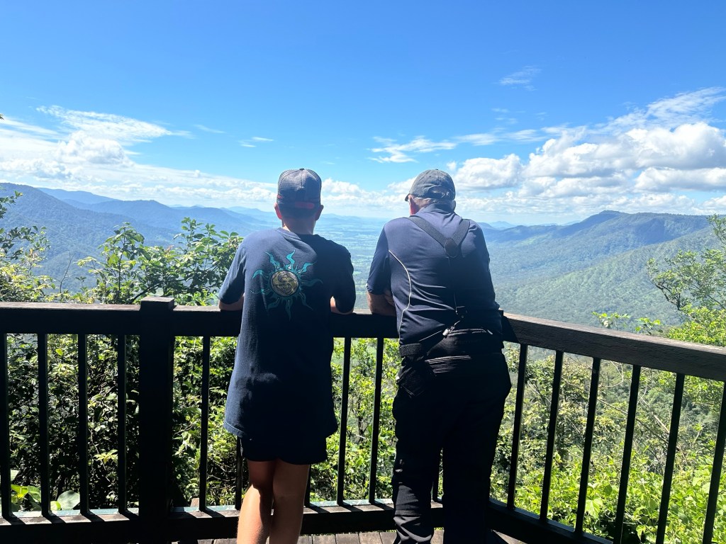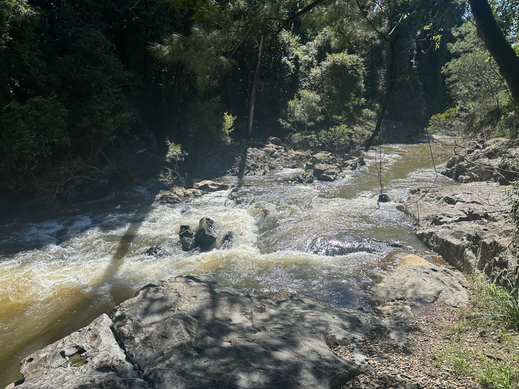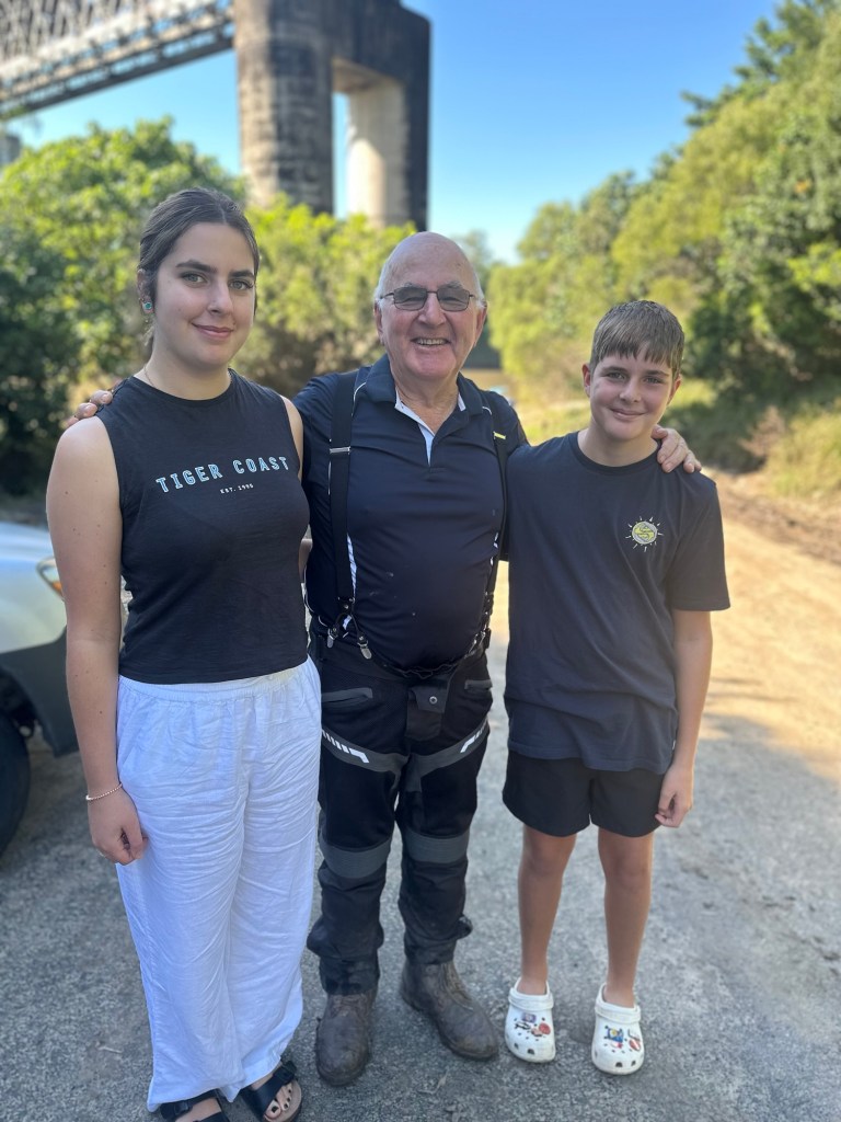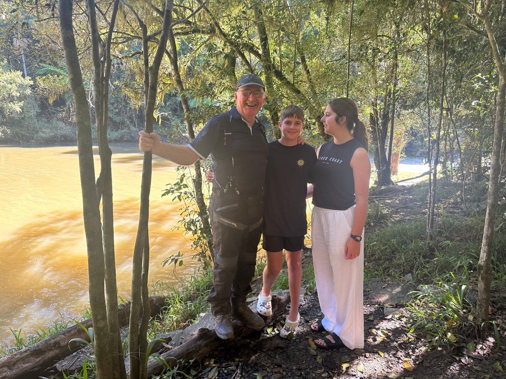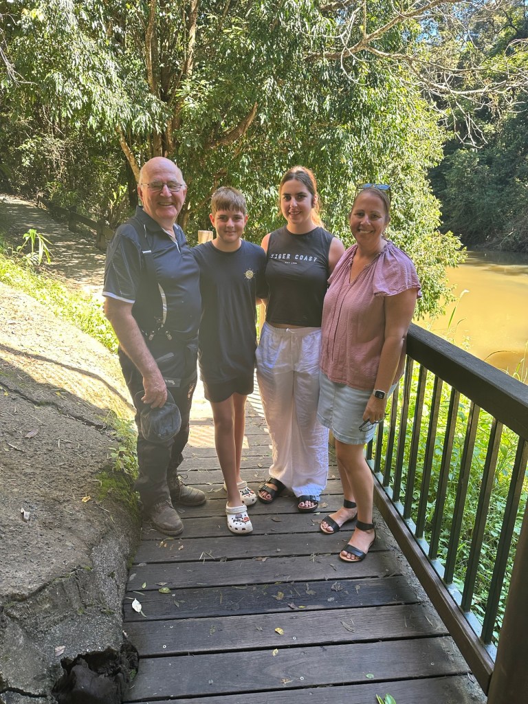 The kids didn’t know, but Dad and Alan Mara were up this way on their motorbikes and we’d arranged to meet up as a surprise for the kids. We were supposed to meet at the top of the mountain, but at the bottom of the mountain we ended up finding them. Just past Finch Hatton, I saw a sign that said Platypus Beach so decided to stop in and take a look. As I’m pulling off the road, I look down and see Dad’s and Alan’s motorbikes parked below. I couldn’t believe it! We drive past their bikes and Sammi says that looks like Poppy’s bike and I laughed to myself. Then Dad and Alan came walking up the hill. Sammi couldn’t get out of the car fast enough. Had two very excited kids 🤣